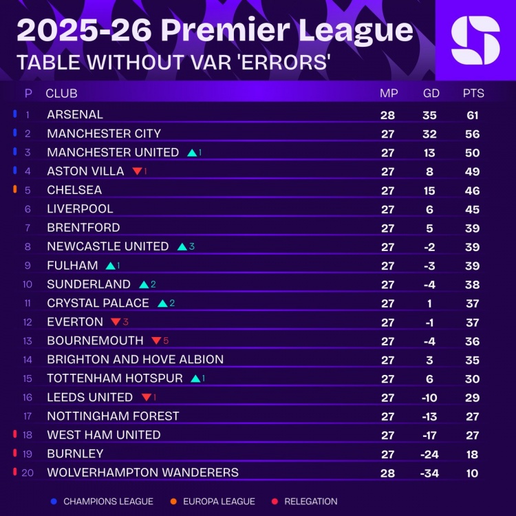 开云平台-VAR未犯错情况下英超积分榜:阿森纳居首,曼城、曼联二三位