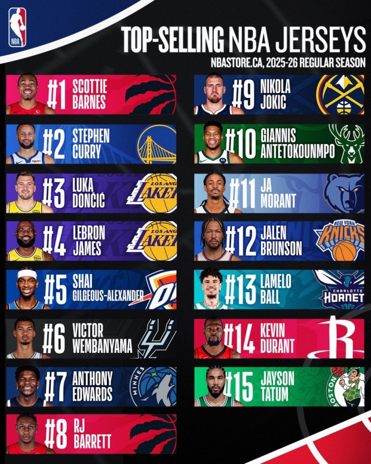 开云首页-加拿大上半赛季球衣销量!猛龙巴恩斯第1 库里第2 亚历山大第5