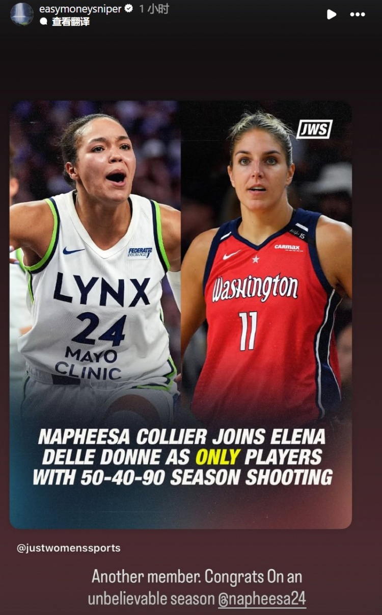科利尔赛季180俱乐部&WNBA历史第二人 杜兰特转发